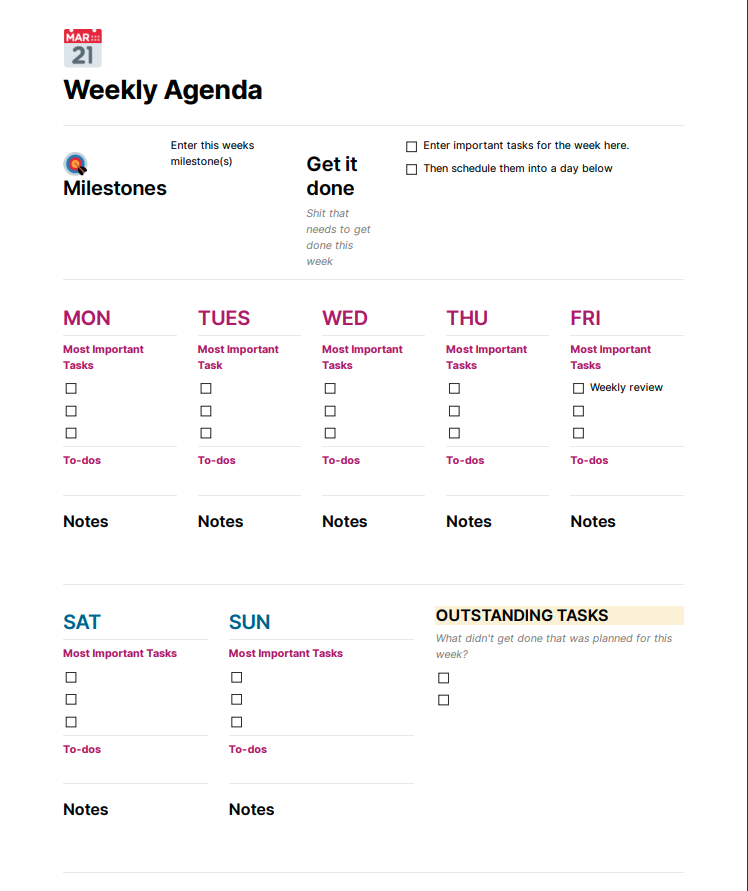 이 템플릿이다. 1주일 단위로 todo를 관리할 수 있도록 되어있다.